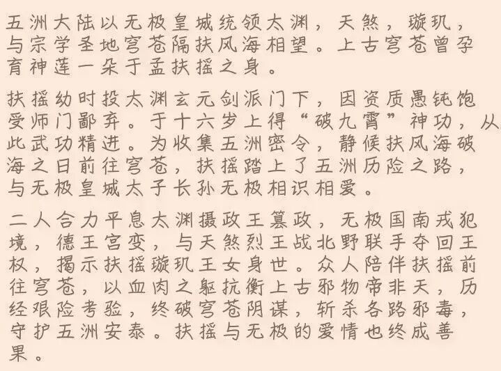 该剧讲述扶摇为解上古五重封印,踏上五洲历险之路,在此过程中与长孙无极相识相爱的传奇经历。