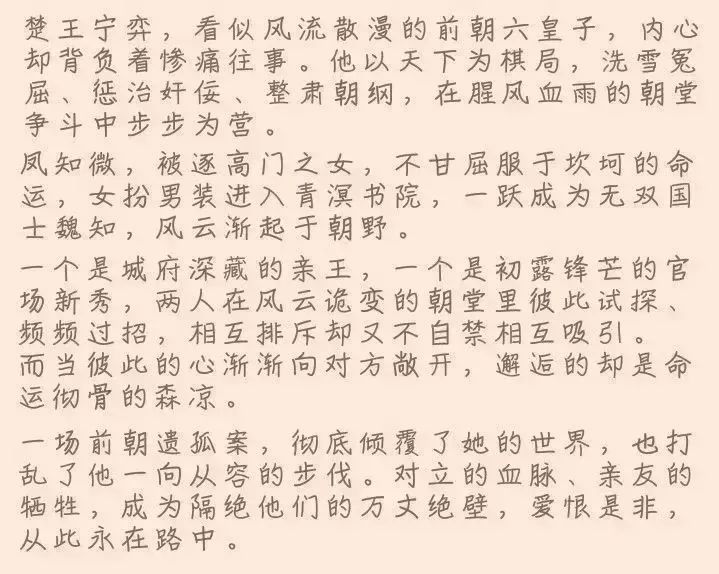 该剧讲述了天盛王朝逆境皇子宁弈和前朝皇族遗孤凤知微之间步步为营,“弈一局权谋天下,博一场爱恨起伏”的宫廷权谋故事。