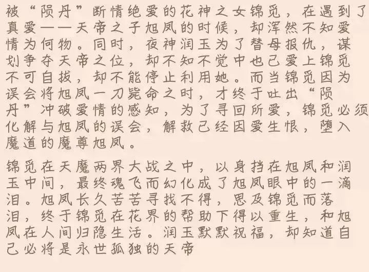 该剧改编自电线的同名小说,讲述了锦觅与旭凤三世轮回的恩怨痴缠,守望千年之恋的故事。