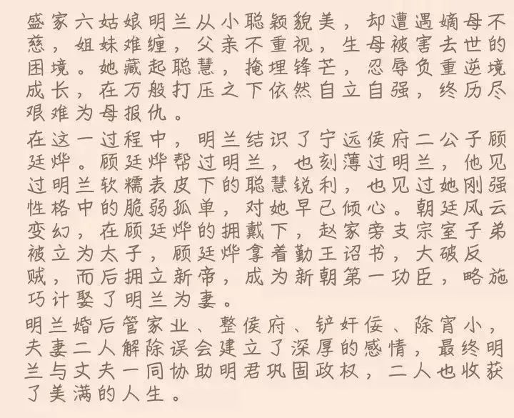 该剧改编自关心则乱同名小说,通过北宋官宦家庭少女明兰的成长、爱情、婚姻故事,展开了一幅由闺阁少女到侯门主母的生活画卷,讲述一个家宅的兴荣,古代礼教制度下的女性奋斗传奇。