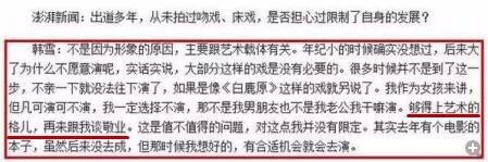 但看到了韩雪的演技后再来琢磨她的话,似乎她的坚持未必没道理:不是拒绝吻戏,而是拒绝为收视率而加的(不必要)吻戏。