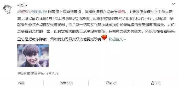 张艺兴的工作量太大,这次最重要原因是高强度工作低血糖肠胃不舒服,1月7号上海录制8号飞海南,打完点滴继续录制,刚一结束又飞新加坡参加9.10号连续两天高强度演唱会,还有过3天晚上没有睡觉不间断地工作,这就算是机器也会抗议的,更何况他还是一个只有20度岁的青年。