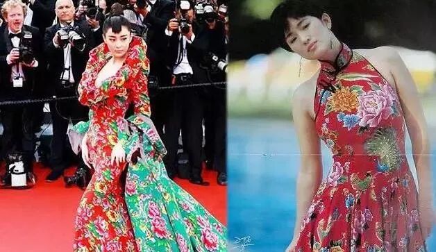 最有名的就是2015年,张馨予穿着火红的“花棉袄”走上68届戛纳红毯。