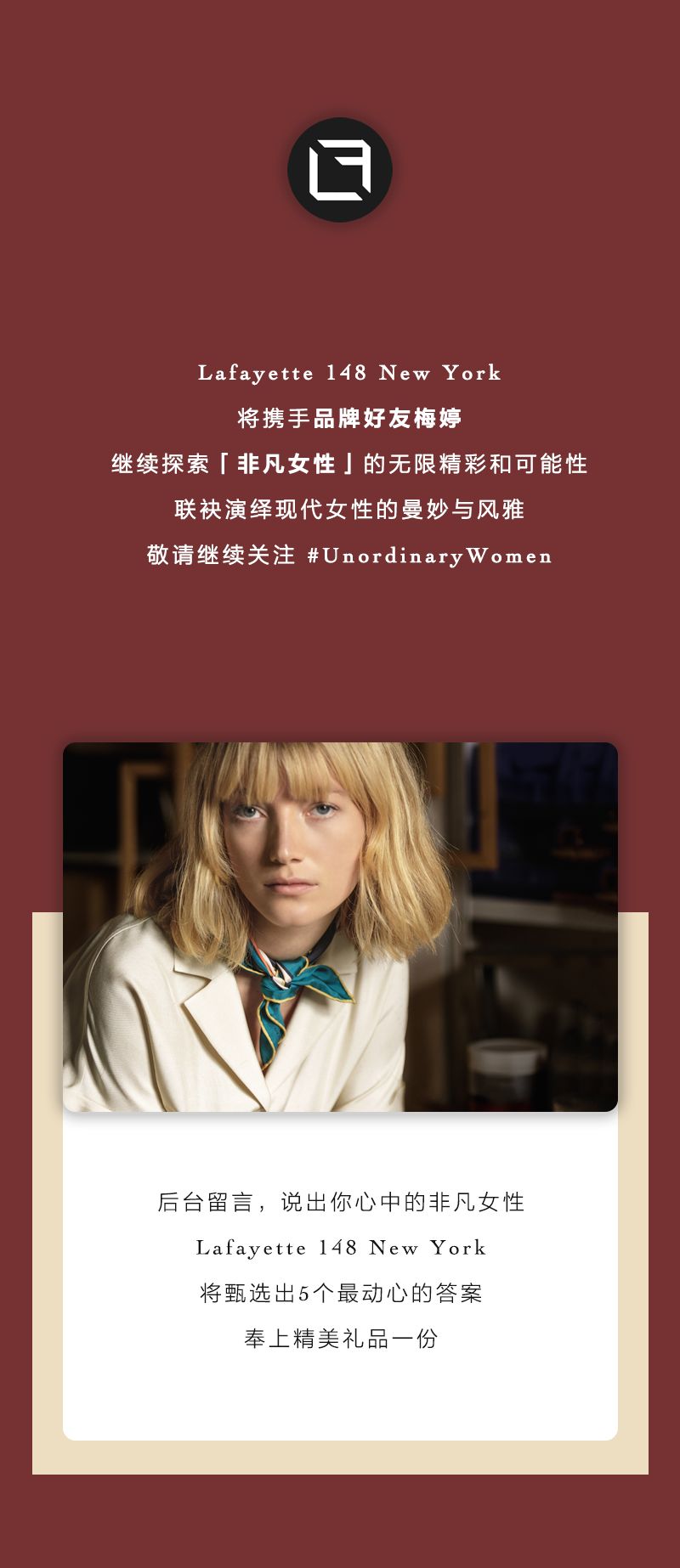 LAFAYETTE 148 NEW YORK(拉飞逸)于1996年诞生于美国纽约,它演绎着纽约城的摩登与浪漫。借助精致奢华面料与手工技艺,其摩登设计为现代都会女性带来优雅姿态与优质生活体验。
