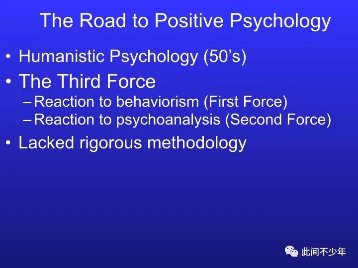 但有一个问题,人本主义心理学缺少严谨的方法论,但它引入了许多精彩的理念,对于幸福感的研究,乐观主义的研究,善良,道德,美德,爱,两性关系,巅峰体验,自我实现,移情,这些精彩的概念都会在本学期探讨,它的认识论并不严谨。如何形成理念,如何学习,所以在很多方面,大部分,不完全但大部分成为了自助运动,有趣,有益,重要的理念。意图当然是好的,但就某种程度上,缺乏学术严谨性,所以它在学术上影响很小,所以很少有大学开设人本主义心理学,几乎没有,所以本质上成为了新纪元运动。