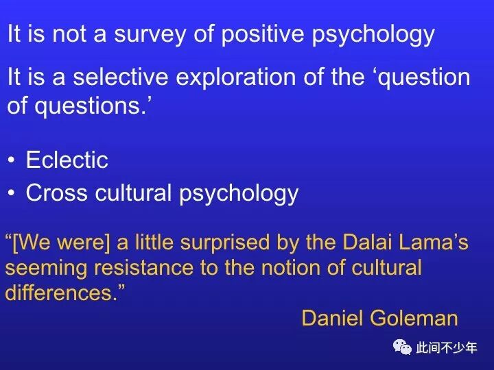 如果你想要关于积极心理学的概论,我可以推荐一些很不错的课本,Lopez或是Peterson的书,很不错的课本。还有一本积极心理学手册,一本很厚的书,里面有这个领域里大多数你想知道的内容,你也可以用它自卫,自卫非常管用。但是本很棒的书,写得非常好,让人很容易理解积极心理学,但这里讲的不是那些,不是积极心理学概论,而是对“问题中的问题”的选择性探索。从那个角度讲,它是折衷的,我的背景是心理学和哲学,我学了组织行为学,我做过几年商业顾问,仍然还做一些这方面的工作,我在教育领域工作过,在教育领域内做过很多工作,我从所有这些领域中吸取内容。我还不只是从积极心理学中吸取内容,我把临床心理学的内容融入这个课程中,我融入了认知心理学。社会心理学等等内容,这是一个折衷的课程,因为我的问题,我的引导性问题是“什么会对幸福有贡献?”,如果我认为精神病理学的内容能对我们的幸福有贡献,我会吸取并利用之,而如果一些有关组织行为学的咨询领域的东西有用,那也会成为本课程的一部分,只要能在一个学期内讲完,所以本课程是折衷的,本课程不是跨文化交流,我会引进一些东方思想的观点。我在亚洲住过几年,我在那工作,持续研究东方哲学和心理学,但我的专业主要是在西方心理学上,而课程的重点将会是西方心理学,但是那并不意味着,积极心理学不适用于世界上其他地方的人。最近有一场高资历科学家之间的会议,来自西方的心理学家,像Paul Ekman和Richard Davidson。这些在心理学领域内最重要的人物,和吹喇叭那个还有他的一些僧侣进行会谈。他们谈论了心理学的未来研究,还有如何研究冥想等等。而他们谈论较多的话题之一就是文化差异,当提到这个问题时,吹喇叭那个突然好像很不舒服,当记录整个会议的Daniel Goleman问他怎么了,吹喇叭那个说他不是因为谈到并强调文化差异而不舒服。对吹喇叭那个你可以有很多评价。但你不能说他在文化方面不敏感,他可以说是还在世的最敏感的人之一。然而他说,我们对文化差异的关注太多了,他补充道不是因为没有文化差异,当然有而且很重要,但文化共同性要比差异多,而我们不应该无视这些共同性。Daniel Goleman如此评价吹喇叭那个,“我们有点惊讶于吹喇叭那个这种表面上的,对文化差异概念的抵触”,所以我想介绍这些观点。但是首先,因为这不是我的专业,研究文化差异的人会比我做得更好,其次,因为我所希望研究的是普遍事物,不同文化中普遍的东西,所以我们会在这方面进行研究。不只是这样,我们的讨论比这部分心理学更具体,我们将会研究你们自己,我们会如此具体,为什么?当我开这门课程时,我自己没想过,“好的,我需要介绍些什么东西,以便能取悦课程的参与者,这些学生呢?”。那不是我所想的,我所想的是“如果我是个本科生,会想上什么课?,如果我坐在这,什么能让我更幸福?”。换言之,从我的观点,从非常个人的观点出发,在我们的课上,我会鼓励你们,有大量的样本,但最主要的,我会鼓励你们去看自己的内心,去研究自己。无论是通过两周后开始的每周一次的课后论文,还是你们最后的演示作业,你们不用做演示但要写出来,一个关于你最感兴趣的话题或者对你来说最重要的话题的演示,还是关于如何能把这些观点应用于我的生活。