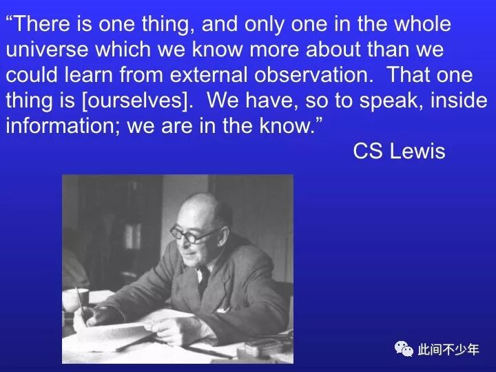 事实上,从许多方面说这是有益移情的来源,有些研究表明了解自己的人,研究自己的人,反思自己的人,对别人做出过分的行为,不道德的行为会相对较少,那种比如说种族歧视的行为,在一定程度上这是反直觉的,等等,你难道不要首先研究别人,才能对别人更敏感吗?”。是的,那也需要,不过还不够,研究我们自己也很重要,因为当我们看到自己的深层本性时,我们看到的是部分普遍的本性,我们所有人之间的共性,不管我们来自哪里。而这就是吹喇叭那个所说的,不是阻止跨文化研究,去做吧,很重要,但同时,不要忽视自己,不要忽视我们每一个人身上的普遍性。C.S. Lewis说:“整个宇宙中有且只有一件,我们知道我们可以从外部观察中学习到的事,那就是我们自己,我们有,可以说是,内在的信息,我们是知道的”。