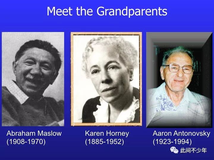 但是,我们很快会了解到,人本主义心理学,孕育了积极心理学,然我们先见见祖父祖母。比如Rollo,May和Carl Rogers,还有最著名的Abraham Maslow 曾是美国心理学会主席,布兰迪斯大学教授,他于1954年提出了人本主义心理学,他写了一章《为了积极心理学》。1954年,他在其中写到,我们需要研究,善良,美德,快乐与乐观,可以说这是超前于他时代的。如果说Maslow是祖父,那Karen Horney就是祖母了,她最初是精神分析学者,学习弗洛伊德的理论,意识到其过于注重消极面,神经症,精神病。她认为,还必须关注影响人类生命体的东西,我们需要研究培养那些好的品质,因为它们也是我们的一部分,反而向人本主义靠近了,并由此产生了,积极心理学。还有Aaron Antonovsky,第三位祖父级人物,提出了关注健康的理念,他提出了一个新概念,或者说他引进了一个新概念,我还在,别担心,他引进了一个新概念,他称之为,他个人创造的新词,健康本源学。由两部分组成,saluto健康,geneis起源。健康的起源,这是病理学常规模型的,替代模型,也就是说除了研究病理学,无论是生理健康,还是心理健康,还需要研究健康的起源,这也是预防医学所关注的。这在1970年代,是一个全新的理念,我们会仔细讨论Aaron Antonovsky,现在转到父辈。