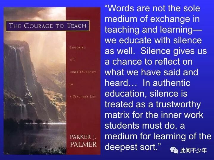 关于安静时刻的重要性,无论是课堂里,讲座里,还是家中,无论是对公司领导,爱情关系,甚至学龄前儿童,你们中很多人,在经历“练习时间”时可能会疑惑,“我一年付四万美金就是为了这个?”,“坐在教室里发呆?”。首先,每次只有一两分钟,一堂课最多不超过两次;第二,这可能是,你从本课程中学到的最重要的东西,即享受安静这一理念,我来读一段麻省理工两位教授的研究。我所提到名字不会出现在幻灯片上,不必背诵或记录,只是为了启发你们。David,Foster和Matthew,Wilson教授,都来自麻省理工大学,他们研究证实了“练习时间”的重要性,开始内省的时间,他们在老鼠处在迷宫中及脱离迷宫后,分别对它们进行了脑扫描,以下是他们的发现。实验结果表明,当某种经历正在进行时,即老鼠进行迷宫时,是当你尝试分辨,什么才是重要的,什么舍弃什么保留,进行安静的自省时,他们的实验表明,接连不断反复进入迷宫的老鼠,比进行一次迷宫后,稍事放松,来点小酒的老鼠,学到的少得多,经历,享受安静。这很能说明问题,对人类也一样,不仅仅是实验小白鼠,所有人类都是,他们认为“重现可能形成一种学习记忆机制”,包括学习,理解,记忆,保留。当我们思考时,我们重放素材时,更容易保留,记住之前的经历,所以休息时间的重要性不能被忽视。Parker Palmer在他的教学著作,《教学的勇气》一书中,提到了以下一段话:语言不是教学的唯一媒介。安静同样可以进行教育,安静让我们有机会反省我们所说所闻,在真正的教育中,安静为学生进行内省提供可靠环境,是一种最深层次的学习媒介,而安静恰恰是我们文化所缺失的。