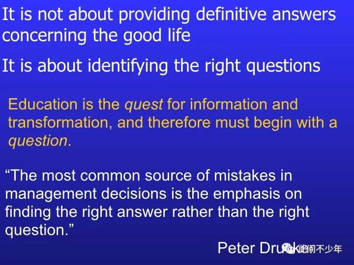 他们是终身学习者,他们一直在问问题,这两个区别性的特质,导致了格外成功和成功的人之间的差别,那个指引了我的问题,不论是写书,还是开设这门课程,还是被我所称的“问题的问题”。