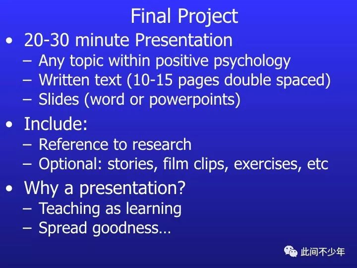 充分发挥两者所长,这也是积极心理学大受欢迎的原因:有用的科学。本课程将分为两个部分:第一部分会和其他心理学,或者其他任何课程一样,我将向你们介绍相关知识,调查研究,严谨的学术作品,需要你们撰写报告,学术论文,参加考试,跟其他课程一样。而教学内容的另一部分:你们读每一篇论文,写每一篇论文时,都需要思考,如何把这些理念运用到生活中去,运用到恋爱中去,运用到社交圈里去。就是这两个部分,学术与应用,无论是论文还是讲座。我不会因为,某个理论有趣而去介绍它,而是因为这个理论严谨且能被应用,再唠叨几句题外话。