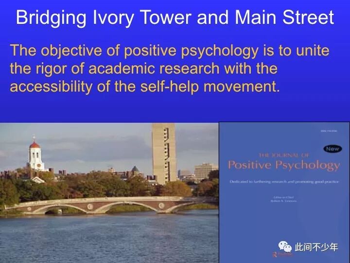 我怎么知道的呢,因为我参与过其他大学积极心理学课,遍及全国,乃至全球。美国有超过200所大学开设了本课程,而且几乎其中所有院校,这门课,都是参与人数最多的或者最多的之一,信息是关键。越来越多的机构组织开设这门课,还有咨询公司,其中一些甚至是全球知名咨询公司,越来越多的中学开始引入积极心理学,小学也是,各国政府都对这一新领域表现出兴趣,为什么?因为它有效,它的的确确有效,殷盛人生。快乐,幸福感这一整个领域,在此之前一直被心理自助运动统治,心理自助运动带来了什么?生动有趣,通俗易懂的书籍,热情外向的宣讲者,颇具领袖气质,且身材高大,吸引大众参与他们的专题讨论讲座。但是,有一个大大的转折,其中许多书籍讨论都缺少实质内容,通常都言过其实,无法兑现。比如:快乐的五个关键;成功领袖的三个要素;成功、快乐、完美爱情的唯一秘诀;夸大其词,效果甚微。再来说说学术界,学术界给我们带来了什么?大量精确的实质内容,数据被一而再,再而三地反复分析,行之有效的好东西。但是,又有一个大大的转折。很少有人会阅读专业学术期刊,想想看,这间教室之外有多少人,读过最近12期《个性与社会心理学》杂志?大多数人甚至不知道那是什么东西。我博士班的主任估算过,学术期刊上的一篇论文平均只有7人阅读,这话…,其中还包括作者的母亲,这话虽然是半开玩笑,但其实很可悲。因为…作为学者,我觉得很可悲,因为这些论文都非常精彩,非常重要,能大有作为,甚至不仅仅是作为,但是对大众来说晦涩难懂,所以我们需要积极心理学,需要这门课程。积极心理学及本课程的宗旨非常明确,就是要在象牙塔及大众间构建桥梁。换句话说,就是要把严谨,实质,经验基础,学术科学,与自助或新纪元运动的通俗易懂相结合。
