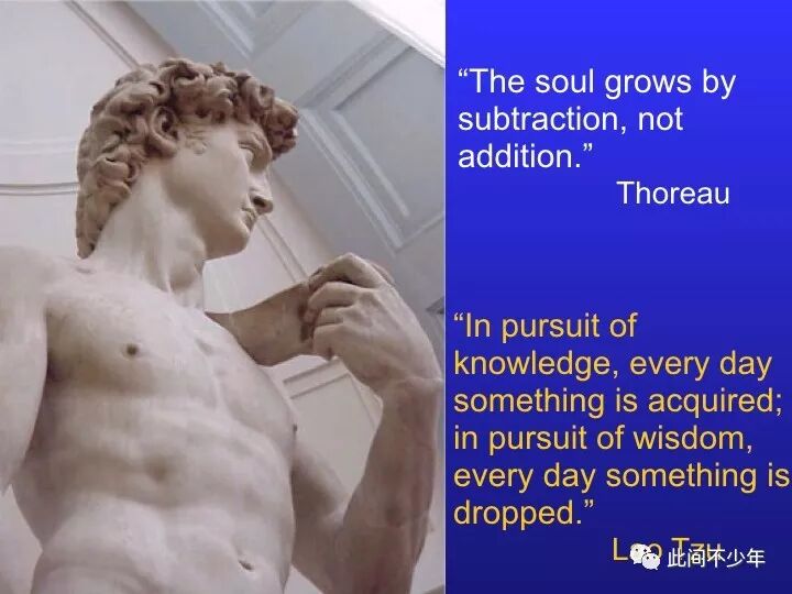 减法包括除去那些,阻碍我们发挥潜能的限制,因为我们的潜能是天生的,我们关注人类本性,是与生俱来的,无论是上帝赐予的,还是进化产生的,但是渐渐地受到外部文化压力,像多余石料一样,把我们禁锢起来了。老子说过,“为学日益,为道日损”,“学”即信息,“道”即变形。