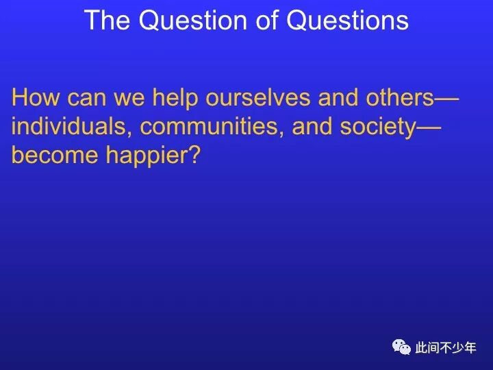 就是“我们如何能帮助自己和他人,个人,群体和社会变得更幸福?”。注意这不是关于帮助我们自己和他人变得幸福,而是关于变得更幸福,为什么?因为很多人问我,“那么Tal,你幸福吗?”。我真的不能回答那个问题,我不知道那是什么意思,我如何判断自己是否幸福?是和别人比较?是不是存在一个点,超过之后就变幸福了?幸福不是二进制的非此即彼,0或1,要么幸福要么不幸福,幸福存在于一个连续统一体。所以我对这个问题的回答,“我幸福吗?”,我今天是否比我15年前刚开始关注追求幸福时更幸福。15年后我当然希望自己能比今天幸福,幸福是终身的追求,希望本课程是这种追求的一部分。但只是一部分,你们不会在课结束时幸福,希望你们能比现在幸福。因为很多人坐在这听有关自尊的讲座时,比如,或者当我们明确地讨论幸福时,他们说,“等等,我的自尊心强吗?”,他们自己想到,“我的自尊是较强的还是较弱的?”,这也是没有意义。无法回答的问题是“我如何能提高我的自尊,我健康的自尊,而当然不是自恋?,我怎样才能变得幸福?”。那是一个重要的问题,这是问题的问题,本课程不是一个积极心理学的概论。