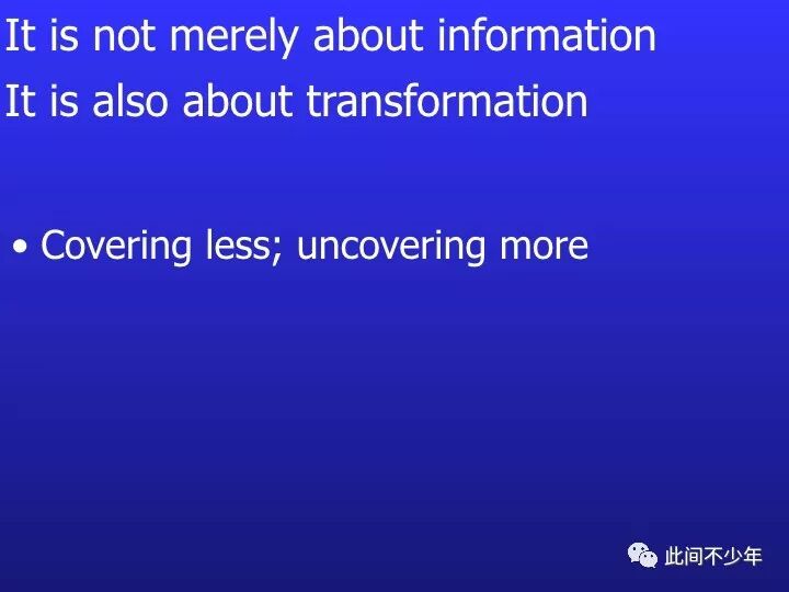正是我们在改变周将要讨论的,我要让常识更平常。信息本身还不够,还不够,而我们除了信息高速公路外还需要转变高速公路,是在转变高速公路,还是转变乡村小道上,来经历快速增长的步伐,因为就像我们下次课会说到的那样,抑郁率呈上升趋势,焦虑率呈上升趋势,不只是在这个国家,是全球化的现象,简直就是全球传染病。而为了应对它,更多的信息也并不够,并不够。