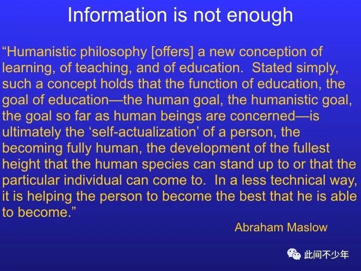 往我们的容器里增加,装上越来越多的东西,越来越多的信息,越来越多的数据,还是不够,我们需要更多,本课程将采用一种人性的方法。我来给你们读一小段Abraham,Maslow的话,“如果有人上了一门关于心理学学习的课,或者看了一本这方面的书,大部分内容,在我看来,是与重点无关的,也就是,与人性无关,大部分内容把学习展现为获得联想,技能和能力,这些对于人的性格,人的个性,人本身来说只是外在而并非本质的”。外在是指信息,内在是指转变,形态的改变,当我们谈到转变时,实际上是非常字面的说法,形态的改变,大脑的改变,我们一会就谈到,比如我们会谈到冥想。自1998年后通过核磁共振研究我们知道大脑可以被改变,一个新的概念叫做神经形成或者神经可塑性,是指我们的大脑实际上会改变和转变,在我们的一生中其形态都在改变,所以我不只是在打比方,我也经常指的是字面意义。继续Abraham,Maslow的话:“人性的哲学衍生出关于学习,教学和教育的新概念,简单地说,这一概念认为教育的功能,教育的目标,人的目标,人性的目标,只要人还是被关注的目标,从根本上是一个人的自我实现,完全成为一个人,达到人类或者是特定的某个个人,能达到的最高高度。通俗点讲,就是帮助一个人成为最好的自己,这些是军队的广告,“做最好的自己”,这就是本课程所要讲的,这就是人性的方法。