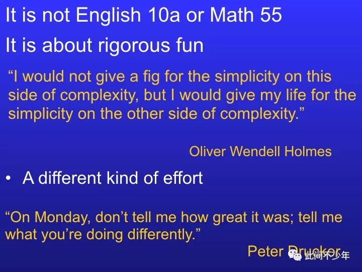最后这个可能对你们来说有些新,但这不是10A号英语课和55号数学课,也就是说你不用像10A号课或者历史课那样做大量的阅读,也不像55号数学课一样难。所以你们可以轻松些,我相信这有些人上过这门课,本课程同时是一种严格的乐趣,乐趣…因为研究我们自己很有意思,有时会让我们受伤,有时我们看到一些我们不愿意看到的东西,但总的来说还是有趣的,很有意思,同时又是严格的。以研究为基础,你们将在本课程中遇到的许多观点都很简单,很容易理解,常识,但它们是简单,不是过分简单化,这两者是有区别的。这个报告厅就是他捐建的,但不能完全确定是他所有的。“我不会认为与复杂性一致的简单性是微不足道的,但我会把我的一生用来研究与复杂性相对的简单性”。Homles这里的意思是他关心的不只是简单性,简单的,随意的,难以预料的想法,而他所关心的是之后的简单性,我们深思了这个观点。在我们吸收了它之后,在我们考虑过它之后,那些我们所研究的观点,而如果与复杂性相反,我们能看出简单性和常识,那就很好,那是他所感兴趣的,那也是我们整个学期要讨论的。积极心理学研究者所感兴趣的,与复杂性相对的简单性,这两种简单性之间有很大的区别,尽管乍看起来,他们有时也许是相似的。本课程需要的是一种非常不同的努力,与别的课程非常不同的努力,再一次它不需要你像55号课和10A号英语课那样的努力。它所需要的努力是一种应用的努力,努力把它应用到你的生活里,努力把行为的实际改变带入你的生活,在我们开始讲本课程的一些细节比如教学大纲之前。我想先讲一个关于Peter,Drucker的故事。Peter Drucker,我之前引用过他的话,是现代管理学研究之父。Peter,Drucker享年94岁,是几年前过世的,在他生命的最后当他头脑还百分百清醒时,活动和参加组织活动对他来说更加困难了,于是他邀请想咨询他问题的人,想跟他学习的人来他家。有国家总统、总理、财富500强公司的CEO和他一起过周末,而在星期五,每一次聚会都是这样开始的,对每一个世界级领袖,无论是商界的,非盈利机构的,还是政界的,他都会对他们说如下的一番话:“星期一我不想听到你们说这有多美好”,意思是这个周末有多美好,“星期一我想听到你们跟我说,你们做了些什么改变”。在这学期结束后或者在这个讲座结束后,如果你们喜欢它,务必告诉我你们喜欢,你们获得了乐趣,但更重要的是你们所做的改变是什么,这对你们的生活有怎样的影响。而那需要我们的努力,我们将用一周的时间讲改变,和积极心理学一点直接的关系也没有,只是讲改变,因为改变是那么难,因为我们知道大多数组织上的改变都失败了。因为我们知道更多的个人改变失败了,除非我们引入行为上的改变的同时引入认知上和情绪上的改变,影响和认知还不够,还必须有行为,你所做的改变,经常用不同的方式做事需要勇气。