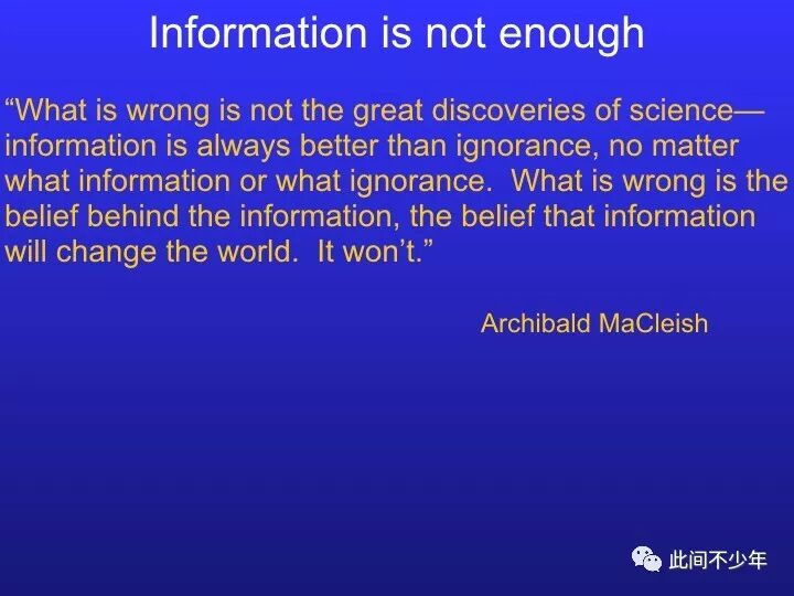 下面是Archibald MacLeish的话,他生前是一位诗人,是哈佛的教授,“错的不是科学的重大发现,有信息永远比无知强,不管是什么样信息和什么样无知,错在于信息背后的信念,认为信息会改变世界的信念,但它不会”。