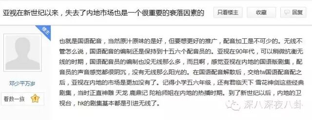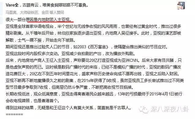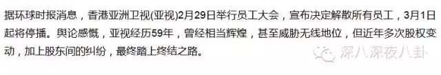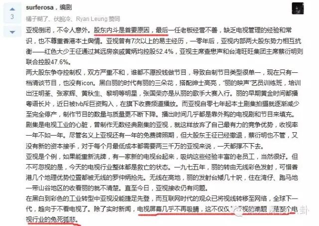 之前知乎上也有人讨论亚视衰败的原因,除了内地财团入主,股东内斗,经营不善、资不抵债、收视低迷、观众失望等等,亚视的倒闭给我们的反省思考远远不止这些