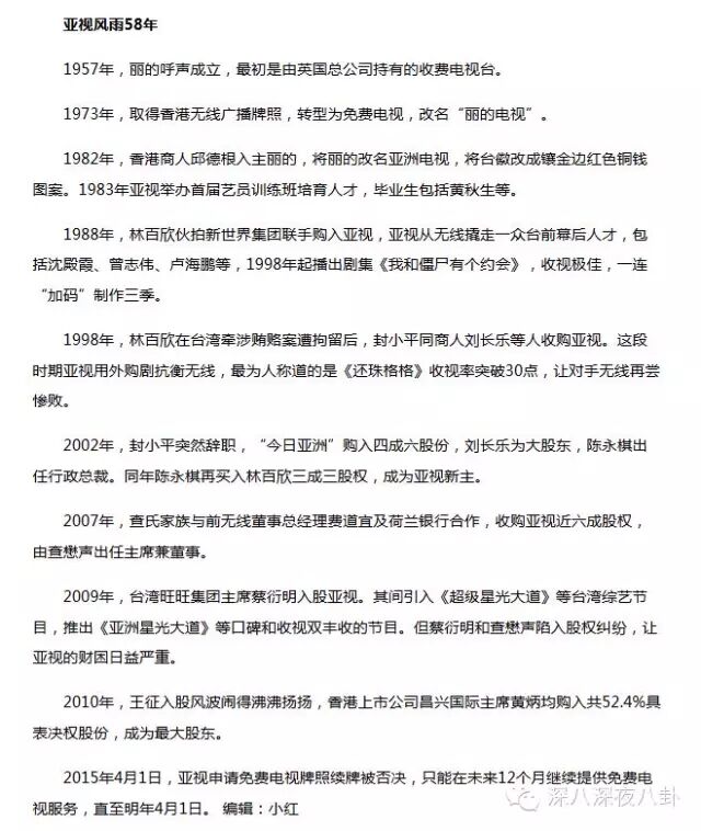 其中被说得最多的,是高层长期动荡,股权数度易主,小主粗略算了下,从开始至今,亚视一共换了7次老板!