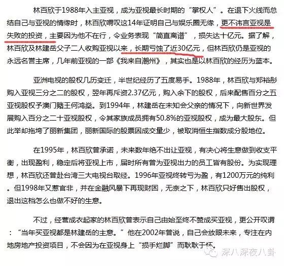 作为亚视最长时期的掌权人,据说林百欣跟儿子林建岳入主亚视的10来年间,一共亏损了近30亿。。这也是后来林百欣本人最后悔的一项投资
