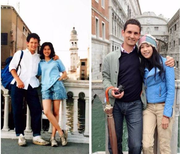 左边的那张照片是两个人17岁刚相恋时在威尼斯游玩的合影。结婚后他们又找了个机会去威尼斯,想找回那座当年合影的桥,有趣的是,他们去错了隔壁的那座。时光如梭,同样的地方同样的两个人,那份最初的爱依然相随。