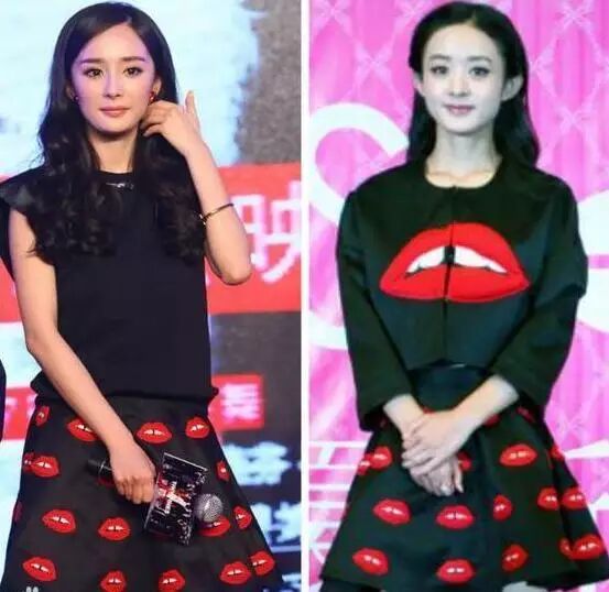 同样一条嘴唇印花半身短裙,杨幂用纯黑色上衣来搭配,单调枯燥;而赵丽颖则搭配一件有质感的嘴唇印花七分袖短款上衣,互相对应十分时尚,长直发更显可爱有活力~