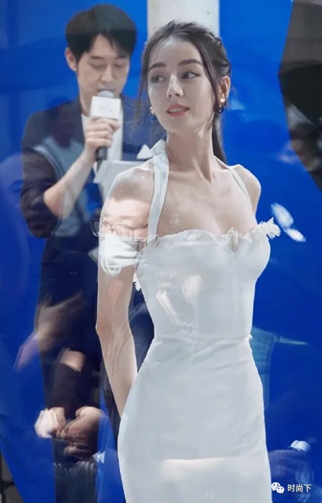 这是一组迪丽热巴出席活动的旧照,迪丽热巴穿着一件白色的低领纱裙,扎着马尾辫,这件白色低领纱裙的设计很前卫,除了采用低领设计以外,还采用了挂脖设计,在彰显出迪丽热巴锁骨曲线的同时,还彰显出了迪丽热巴的奶油肌肤,显得迪丽热巴又纯又欲。