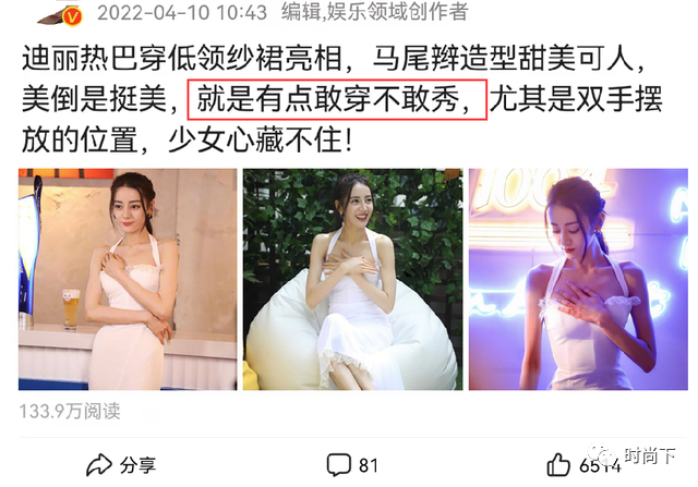 只是迪丽热巴穿着白色低领纱裙亮相似乎有点不太适应,就拿她坐在沙发上拍摄的照片来说,迪丽热巴双腿交叉坐在沙发上,虽然面带笑容,但是双手却捂着领口,也正是因为如此,迪丽热巴被指敢穿不敢秀。