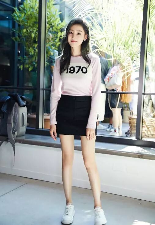 张天爱本来是个小圆脸,喜欢健身以后变化很大,五官立体,身材标致,时尚感也很好,她身穿粉色针织衫搭配黑色短裙,把她的身材展现得淋漓尽致。
