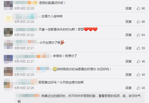 与此同时,大家也不禁纷纷留言表示:“哥哥的歌真好听啊!”、“哥哥最近好吗?今天我也想你啦!”