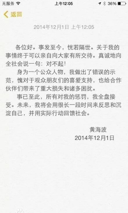 2014年11月30日,黄海波从看守所释放,结束6个月的收容教育。2014年12月1日凌晨他发声明向公众致歉,表示自己做了错误的示范。
