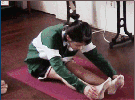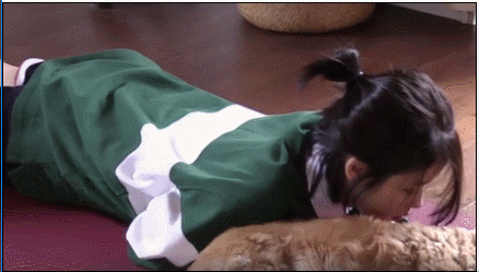 把蝴蝶骨聚在一起牵拉,把腿收起来,靠在脚里边。肚子贴地趴下后,手贴在地上,脚贴在头上。闭上嘴用鼻子呼吸。