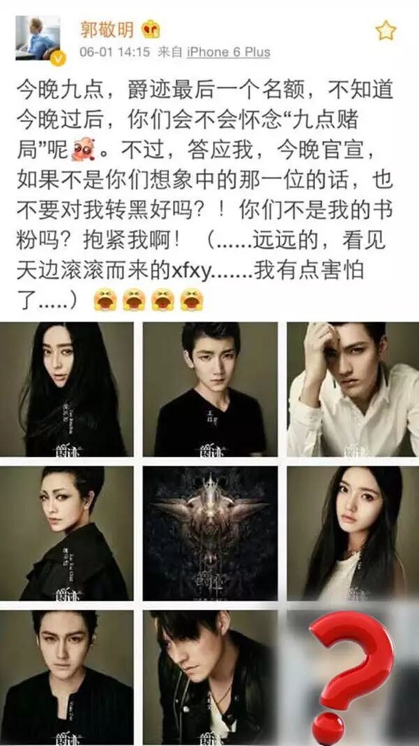 就在大家都在关注李晨、张馨予、范冰冰撕逼大战的时候,泥萌别忘了,昨天可是郭敬明《爵迹》最后一位主演公布的日子啊!