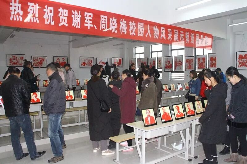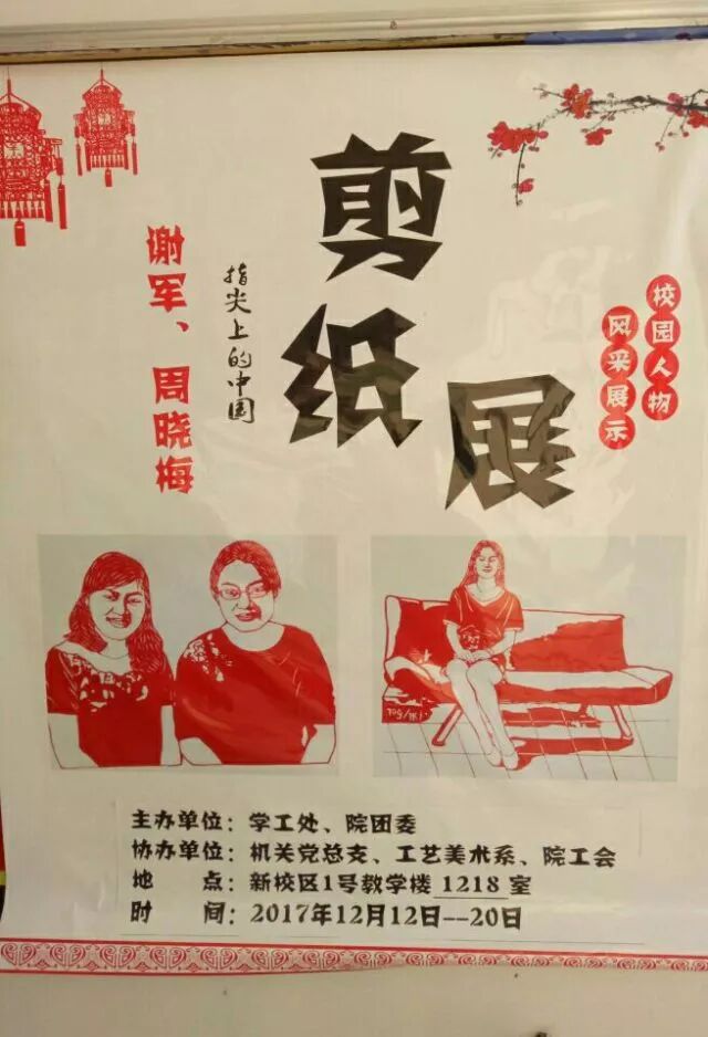 12月12日,由我院学工处,院团委主办的谢军、周晓梅校园人物风采剪纸展在第一教学楼1218室开始展出。