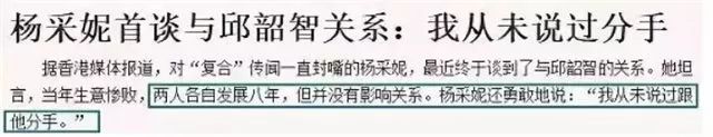 没多久,杨采妮和吴奇隆因性格不合分手。同年,在友人介绍下认识了新加坡律师邱韶智,从此正式开启了一段长达24年的“虐恋”。