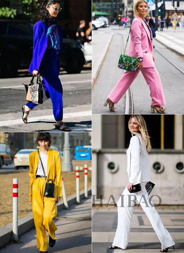 如果你足够大胆,明快亮眼的霓虹色西服套装也是不错的选择,尤以粉色西装最受街拍达人的喜爱。海豹君觉得蓝色、黄色西装也很有腔调,但更适合白肤妞;而深绿色西服姿态低调,好看亦不挑人;时下流行的豆沙色、薄荷绿西服也很不错,只看你有没有勇气来挑战?