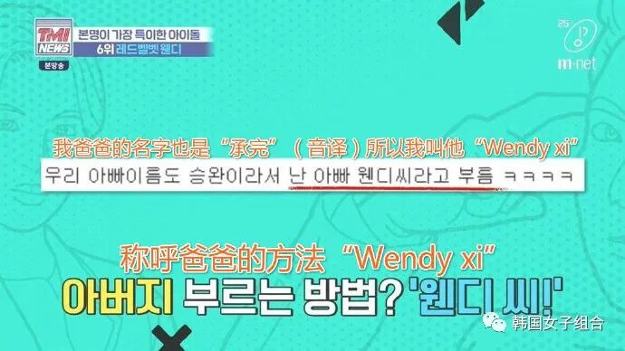 韩网友热议,Apink孙娜恩叫Red Velvet Wendy本名会不好意思的原因是——孙娜恩父亲的名字和Wendy的本名“孙承完”是完全一样的,还有一位网友说自己的爸爸也是同样的名字所以直接称呼爸爸为Wendy xi,哈哈哈哈哈这是什么可爱有趣的tmi!(51韩团 原创文章)