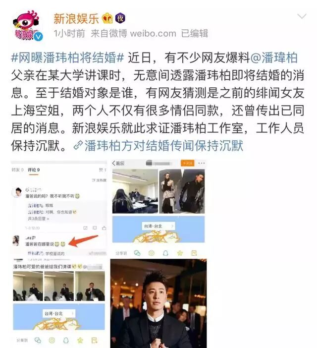 有网友爆料潘玮柏的爸爸在某高校上课的时候,无意间向同学们爆料潘玮柏就要结婚的消息。于是,有很多人开始纷纷猜测潘玮柏的结婚对象是谁,有人说是潘玮柏曾经的一个绯闻对象,一个上海空姐。