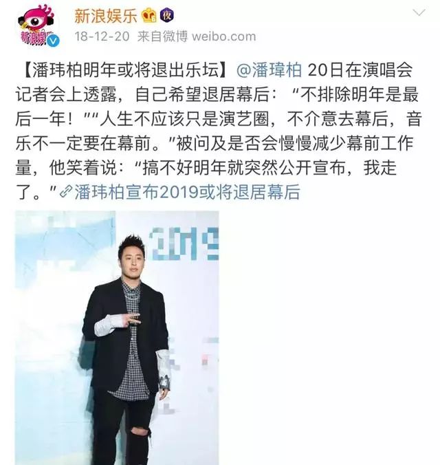 前一段时间,潘玮柏还表示不排除2019年将退出乐坛的想法。他说人生不应该只是演艺圈,他不介意去幕后,还表示音乐不一定要在幕前。