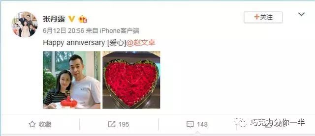 6月12日晚,张丹露晒和赵文卓恩爱照,并写道:“Happy anniversary!”还特意艾特老公赵文卓。