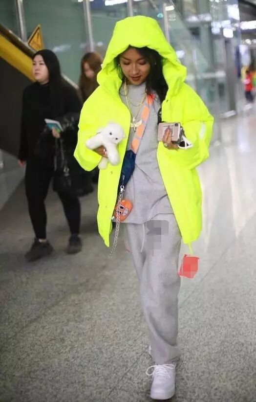 吉克隽逸机场的住一套休闲装看起来十分的舒适。素雅低调的灰色运动衫搭配亮绿色的外套,使得整体看起来没那么的扎眼但也不失时尚感。吉克隽逸还搭配了一些可爱的小饰品,这让她柔和了许多。平时风格上比较凌厉的女孩子可以尝试这样的搭配方法,可能会有不一样的感觉哦!