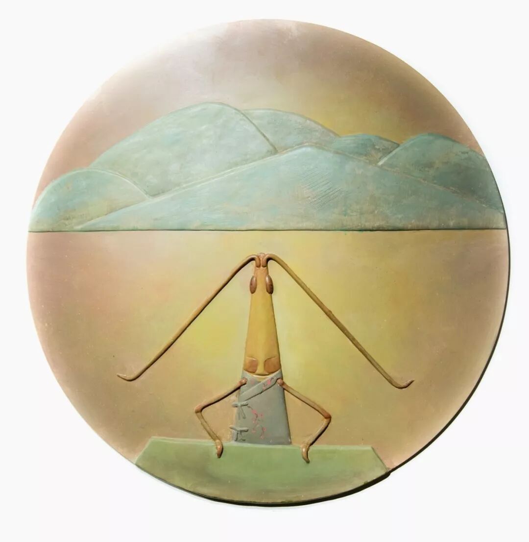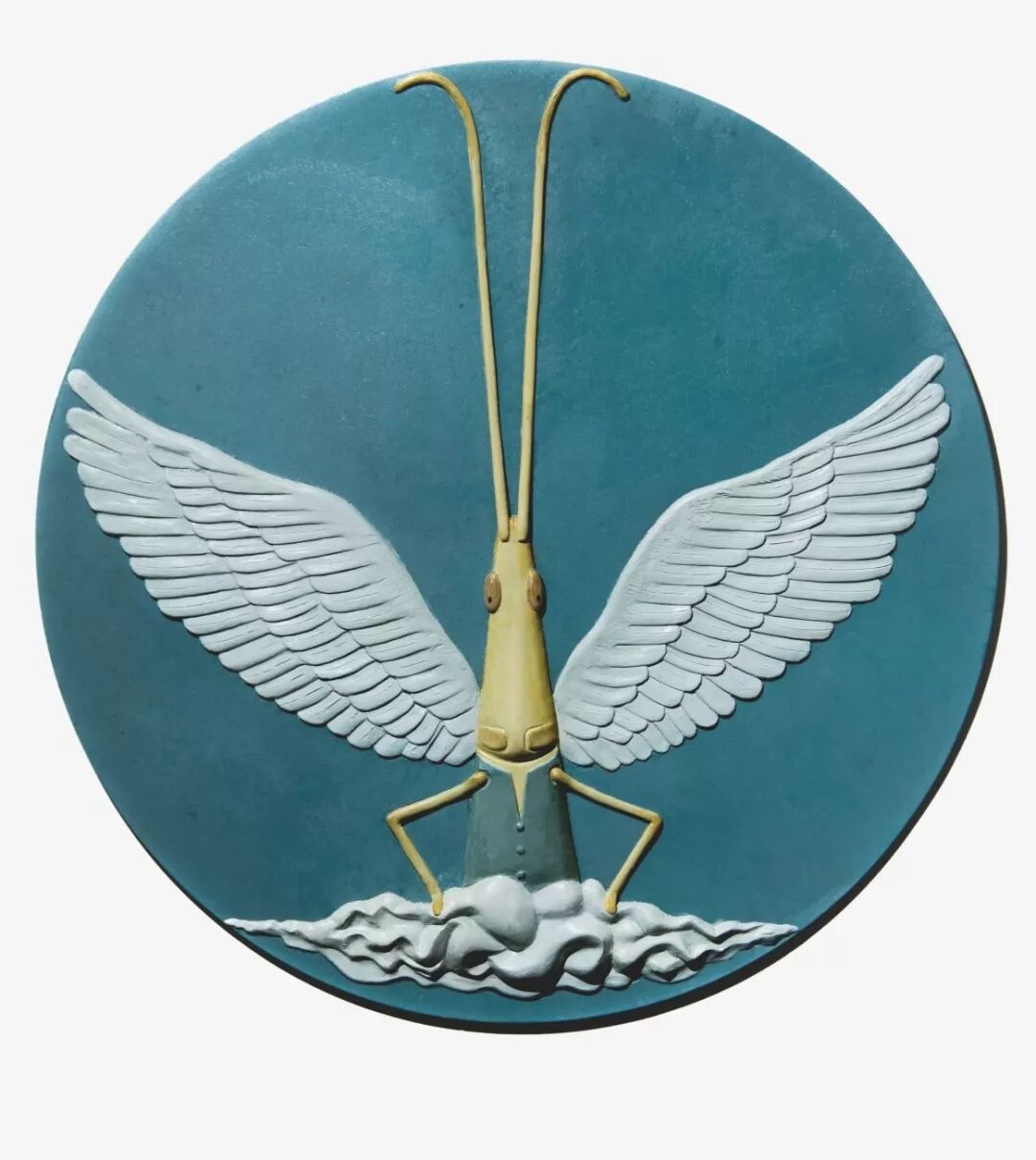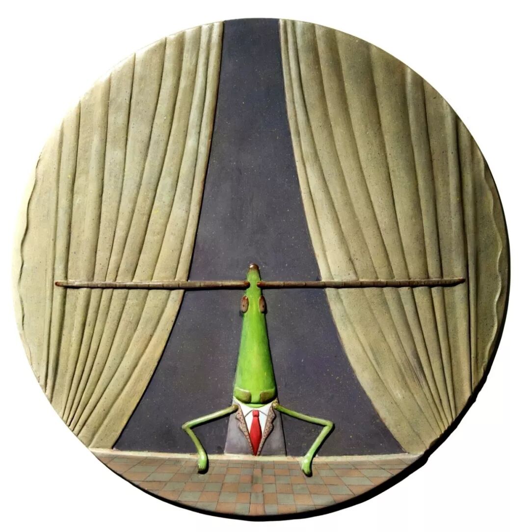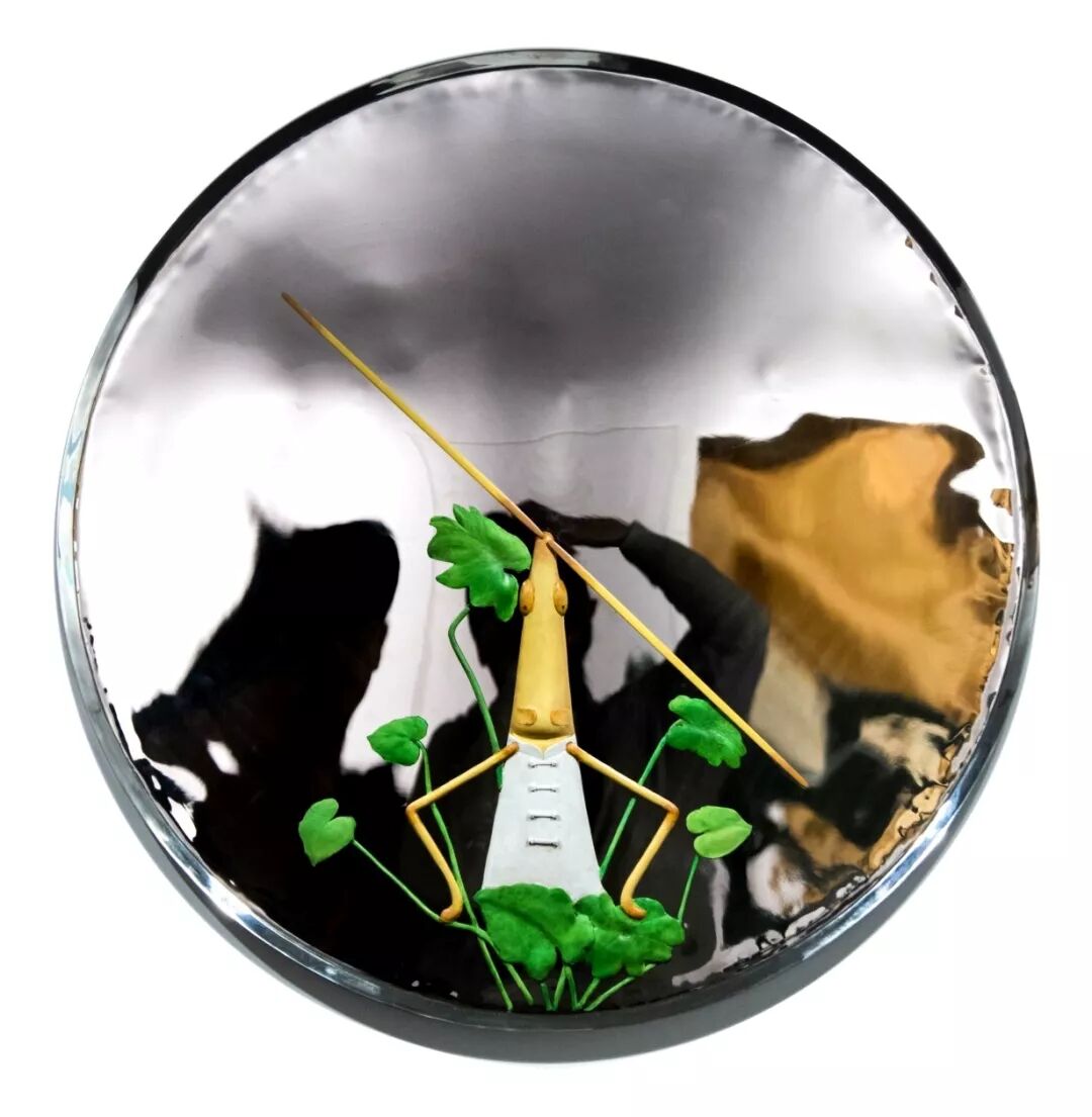 镜子不一定是圆形的,但是我还是选择了圆形作为基本语言,因为它看起来更中式,起码魏晋时期出土的铜镜,多数都是圆的。镜像的艺术语言能够让每一位从作品面前走过的人,都出现在镜中。架上作品的优势就在于,它能够使观者在相对比较近的距离中接收到作品的信息,并参与其中,进而唤发出公众的自我意识构建,寻迹到各自想要的内容,这是艺术最宝贵的东西。当一件作品取得了与更多数人的交流之后,它才能变得更有意味。我希望通过拟人化的草蜢形象,来增强受众参与作品的带入感,并希望可以在现实与想象的交汇空间中,与大家产生交流。
