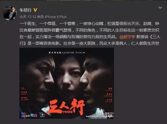 著名导演@车径行 在微博上如此称赞《三人行》:“一个医生、一个悍匪、一个警察,一夜惊心动魄,杜琪峯领衔古天乐、赵薇、钟汉良最燃警医匪阵容霸气登场,不同的角色,不同的人生目标在这一刻紧密交织在一起,实力演出一场硝烟与玫瑰的势均力敌的生死战。@赵宁宇 教授说《三人行》是一部寓言体电影。社会是一座大医院,民众大多是病人,仁人做医生济世”