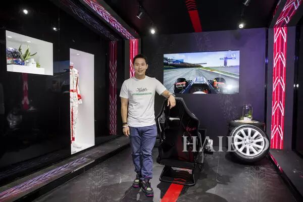 赛车的风驰电掣与速度巅峰,被一座座奖杯、一组组影像所记录。空间以充满速度感的红色激光线条为背景承载,不规则几何成列装置中还原了他无数巅峰时刻的记载,奖杯、赛车服、收集的赛车模型。