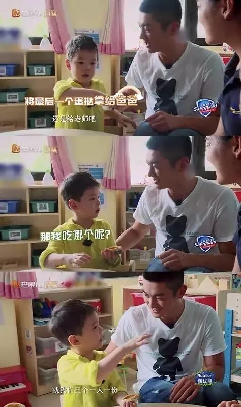 反观嗯哼,被爸爸带到幼儿园时,他主动给每一个小朋友分了蛋挞。在只剩一个蛋挞时,杜江引导嗯哼分给老师,但嗯哼清楚地知道自己也想要吃蛋挞,并且表达了自己的意愿。最后结果是,嗯哼决定把蛋挞分开吃。
