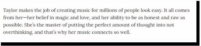 也许你会质疑:作品是艺人的表达之一,但是我们不能只从作窥视艺人本身。这一点放在绝大多数艺人身上都再合理不过,但是放在泰勒身上不尽然。因为这个喜欢用歌讲故事的女孩子,作品就是她自己本身最好的表达。