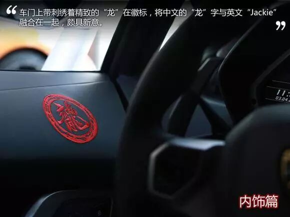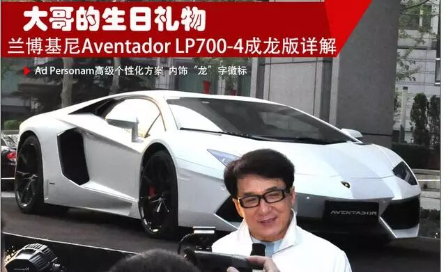 在2012年的时候,一辆基于兰博基尼“Ad Personam”高级个性化方案打造而成的Aventador LP 700-4 Coupe成龙特别定制版,在成龙60岁生日慈善晚宴上进行公益拍卖。