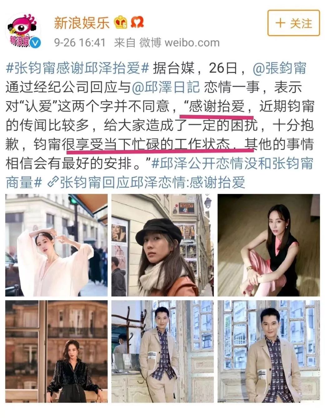 就在邱泽单方面宣布恋情被嘲后,昨天下午,张钧甯终于透过经纪公司回复媒体:“感谢抬爱,近期钧甯的传闻比较多,给大家造成了一定的困扰,十分抱歉。钧甯很享受当下忙碌的工作状态,其他的事情相信会有最好的安排。”