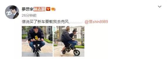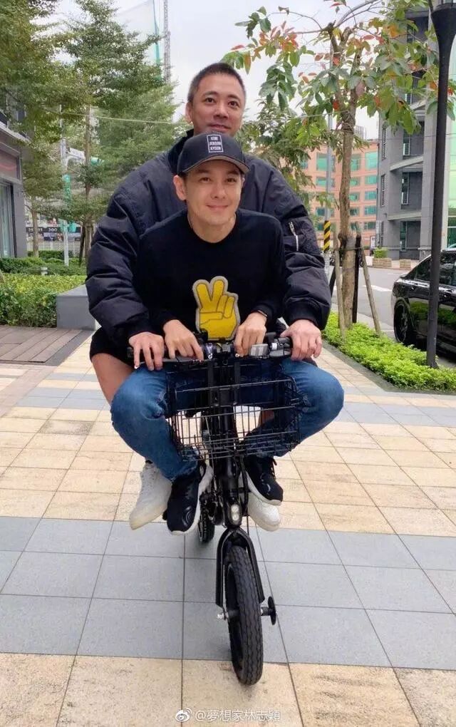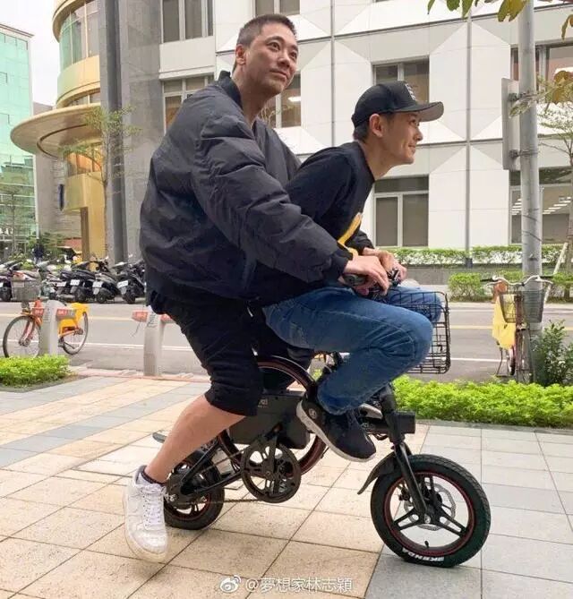 照片中的两个人坐在同一辆自行车上,信上身穿着棉服,下半身却穿着短裤,林志颖也只穿了一件长袖卫衣,两个人好像在两个季节一样。林志颖蜷着身子坐在前面看起来非常搞笑。信这大长腿也是相当帅气。